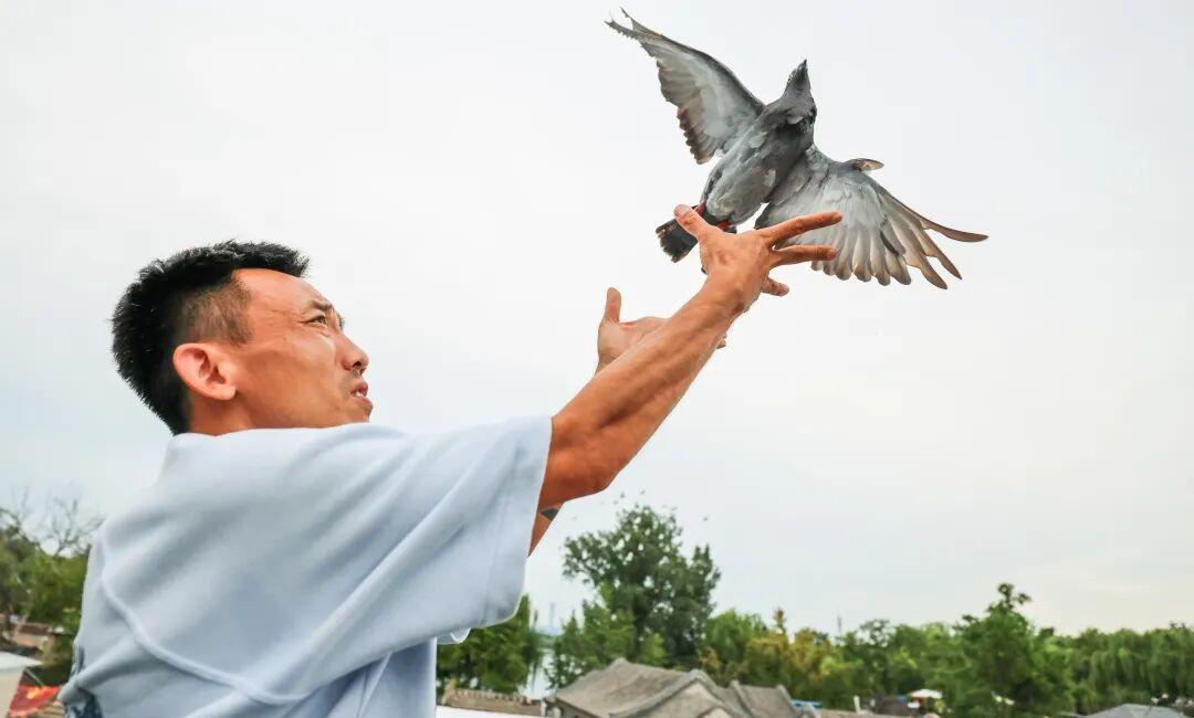 大概过了半小时,鸽子慢慢抬起头,围着大爷转了两圈,随后扑棱着翅膀飞向了天空,朝着家的方向飞去。