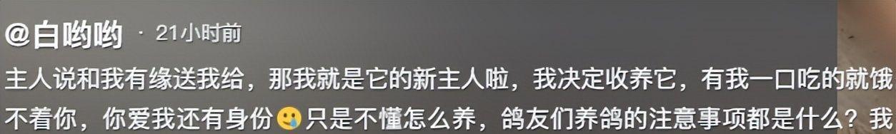 而河南妹子遇到的主人,之所以愿意赠送鸽子,除了“缘分”,也考虑到河南到北京路途遥远,来回运输可能让鸽子受折腾,这份考量,既是对鸽子的爱护,也是对捡鸽者的信任。